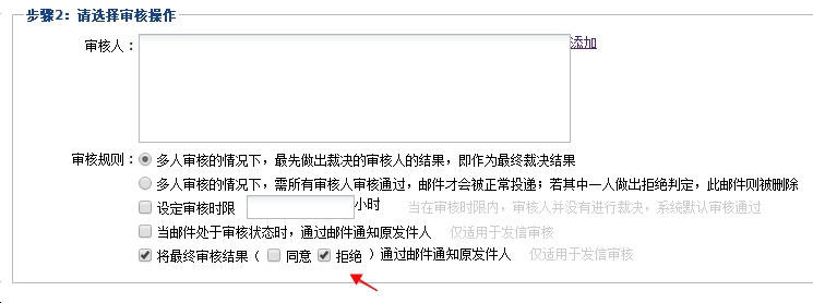 (1)支持最终审核结果通知原发件人时,选择只发送同意或拒绝的邮件
