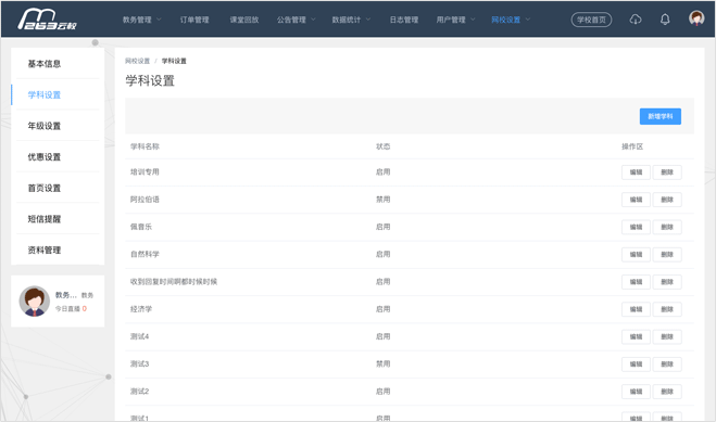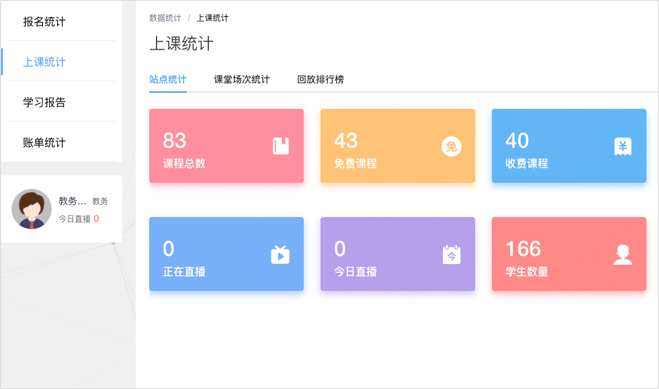 拥有教务管理、用户管理、网校设置等多项后台功能;建班排课,轻松操作; 招生情况、上课情况、随时掌握。