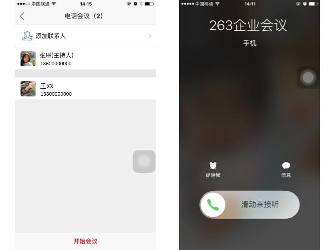 主持人在手机客户端发起会议后,参与人员就会接到来自“263企业会议”的电话