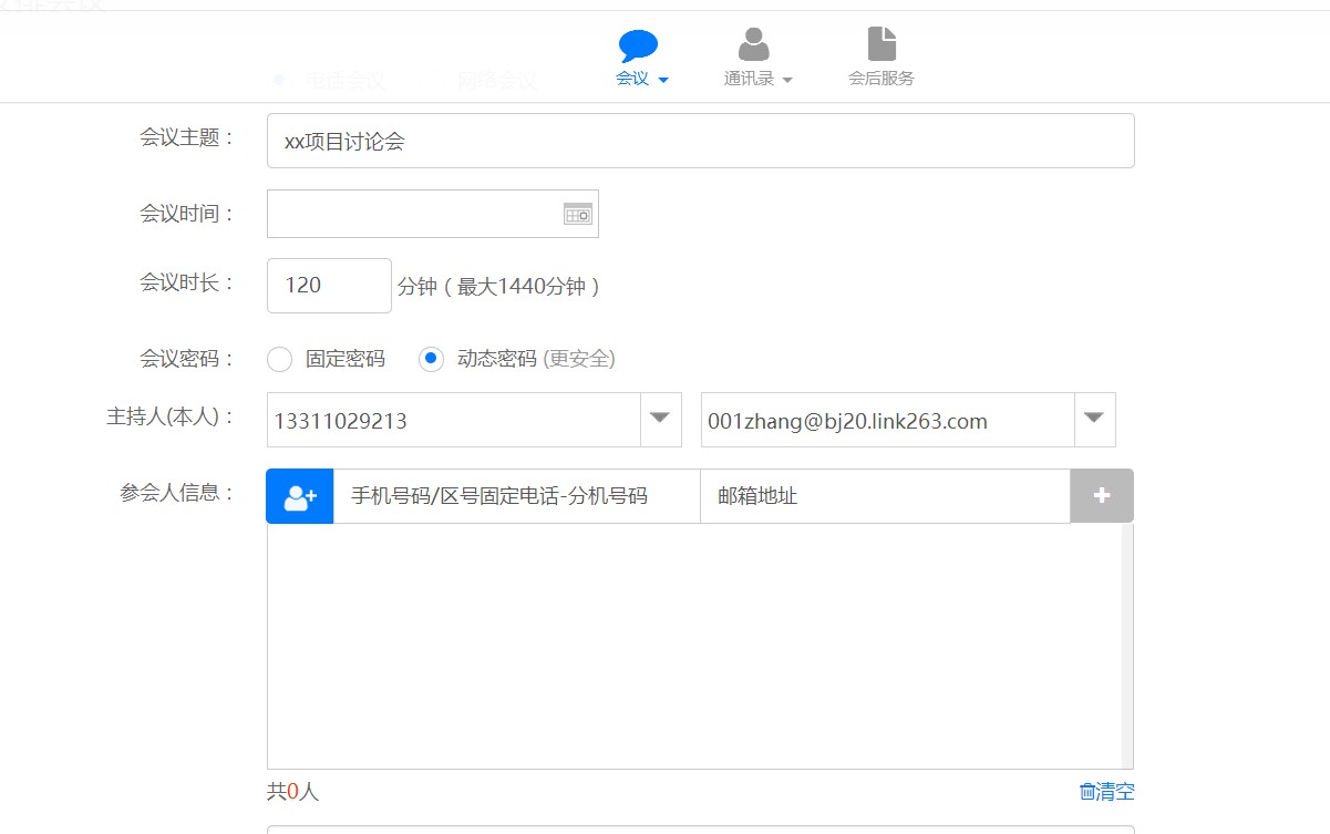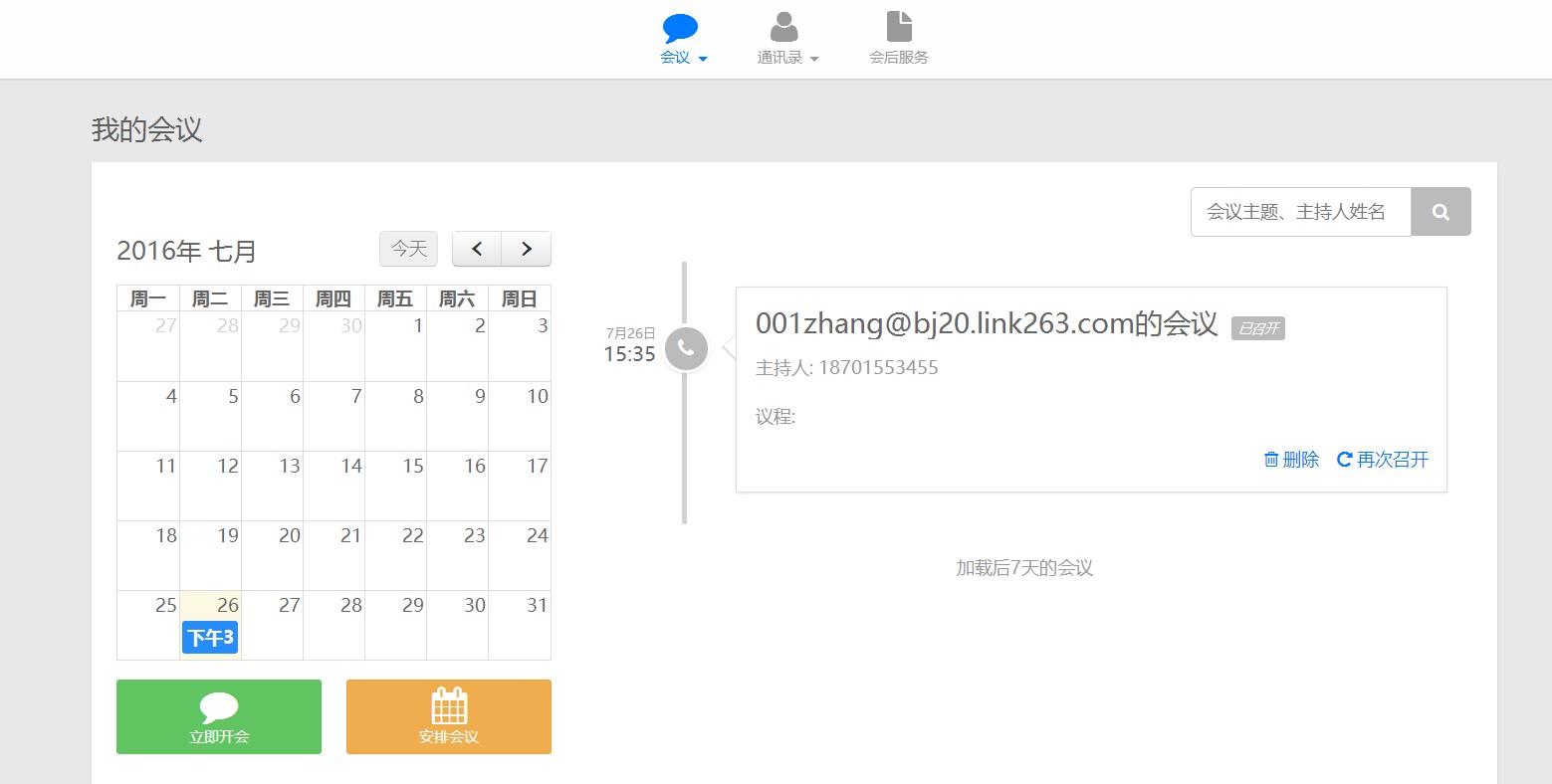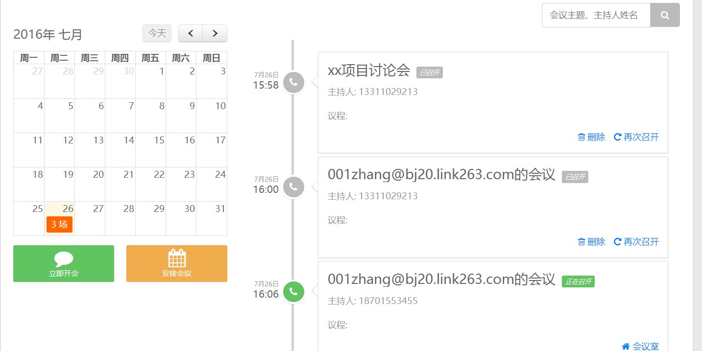 263电话会议可以进行会议监控,登陆后可以立即开会,也可以预约开会。