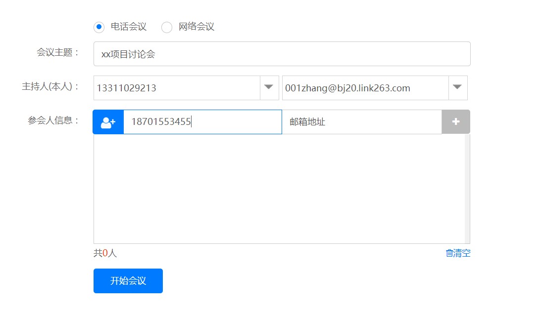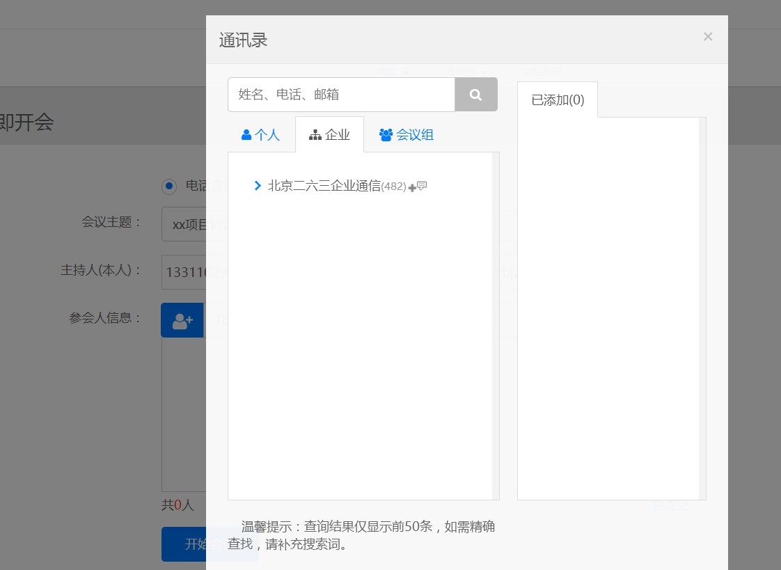 立即开会使用起来比较方便,输入会议主题,设定会议主持人和参与者即可发起。会议发起者可以手动输入参会人员电话信息,也可以从企业通讯录中选择参与人员。
