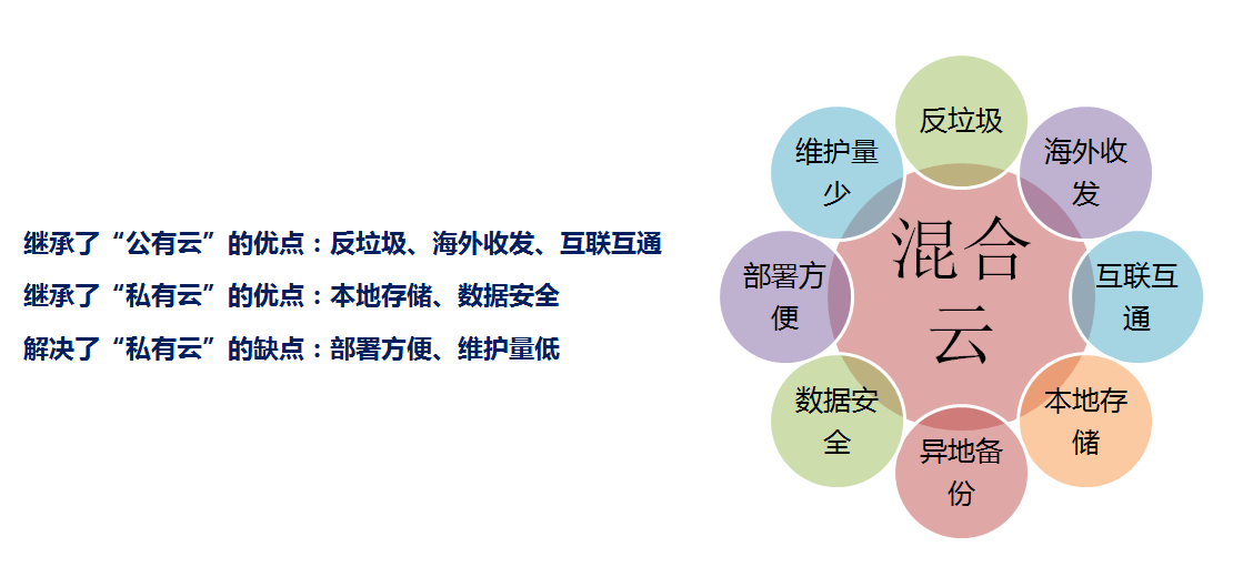 263企业邮箱混合云解决方案既充分发挥了"公有云"的优势,为用户提供诸如:海外收发、南北互通、安全管理、防钓鱼、反垃圾邮件系统等等云端服务,又充分发挥了"私有云"的优势,为用户部署稳定、安全的本地系统。