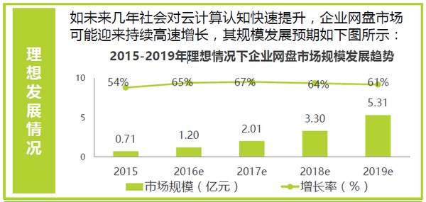 同时随着互联网技术高速发展,云计算技术已深入到企业内部应用,移动办公也开始成为企业信息化建设标配,办公中使用频繁的“文件”安全开始受到企业重视。据Analysys易观发布的《2016年上半年中国网盘市场份额监测报告》推测,个人网盘注册用户超5.4亿,其中约20%的用户(约1.8亿)有办公需求,企业网盘市场“金矿”隐现,企业网盘市场也在不断扩大,据艾瑞咨询发布的《2016企业网盘行业白皮书》,5年内,理想情况下,企业网盘市场规模将达到5亿左右,同时近些年来,中国的企业日见增多,企业越做越大对内部资料的管理也相当重视,企业网盘的市场前景将一片光明。