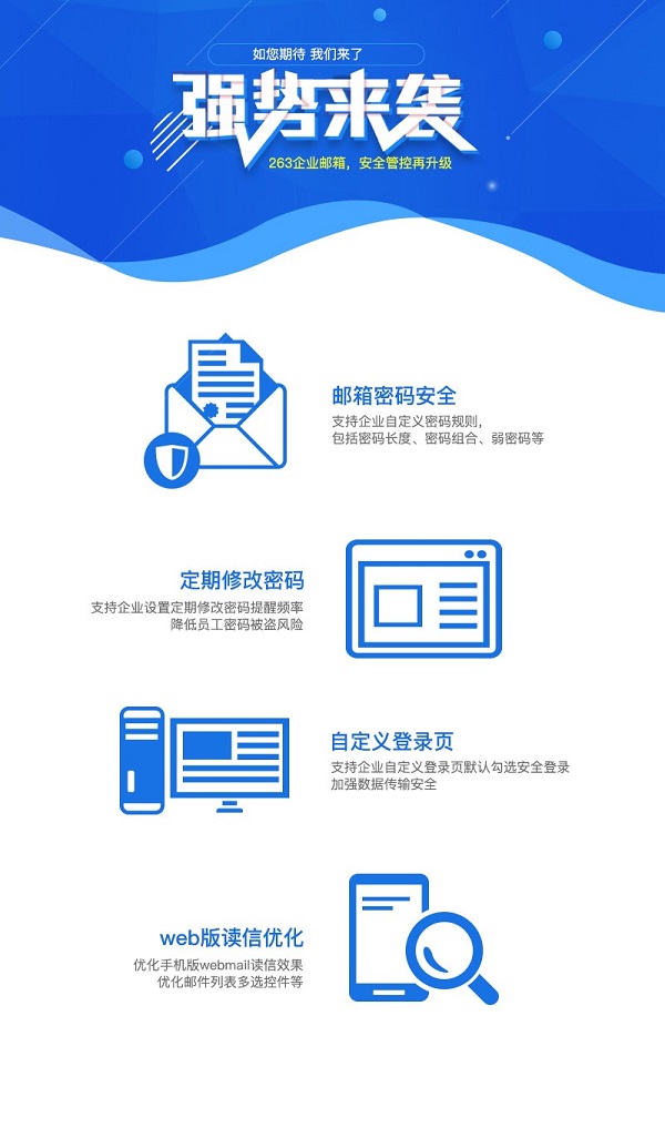 2018年初,263企业邮箱安全管控再度升级,针对邮箱密码安全,支持企业自定义密码规则,包括密码长度、密码组合、弱密码等;支持企业设置定期修改密码提醒频率,降低员工密码被盗风险;在自定义登录页方面做了安全优化等。