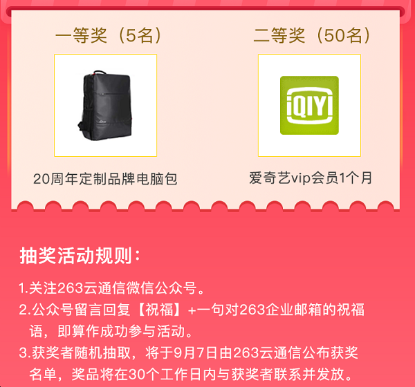 值此 20周年之际,为感谢客户合作伙伴一路相伴,263企业邮箱“感恩有你 一路相伴”20周年特别活动,关注263云通信微信公众号参与活动既有机会赢得定制豪礼。