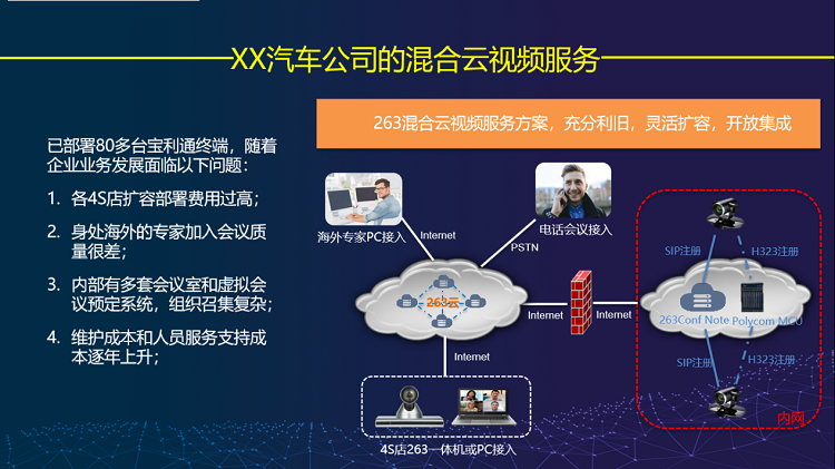 案例中的客户是国内一家大型车企,海内外的工厂、合作伙伴等频繁沟通的需求,与现实的时差问题、领导员工出差导致会议时间、地点无法固定等问题无法平衡。通过与263的合作,我们利用混合云部署方案,共同打造了一个能够融合集团内所有平台的,具备高可用性、兼容性好的云上统一通信沟通平台,解决了集团内部、海外合作伙伴的协作沟通需求,也为客户的IT部门由成本中心向业务中心转型起到了很大的推进作用。