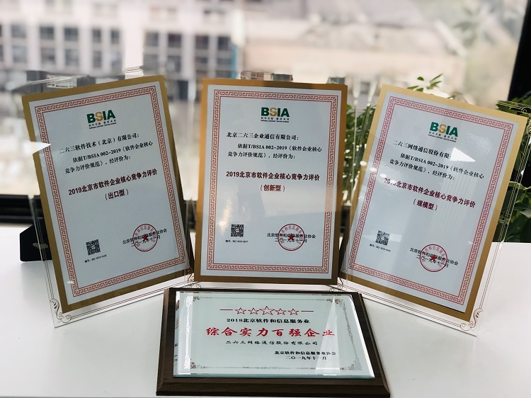 11月20日,北京软件和信息服务业协会(以下简称:北京软协)第九届会员代表大会第三次会议在京顺利举行。北京软协发布了2019北京市软件企业核心竞争力评价报告和2019北京软件和信息服务业综合实力百强企业报告。经评审组层层审核,二六三喜折四桂:263网络通信凭借出众的综合实力,荣获综合实力百强企业,并且263网络通信、263云通信和263软件技术分别入选规模型、创新型和出口型软件企业核心竞争力名单。
