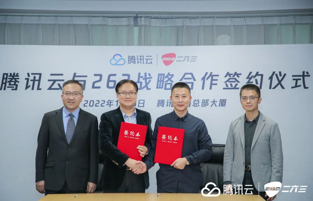 2022年11月3日,263与腾讯云举行高层会谈及战略签约仪式,双方将整合各自优势,在政务、运营商、金融、医疗、教育等行业深度合作,共同推动产业互联网的纵深发展。腾讯云副总裁沈可、腾讯云运营商行业总经理任志国、263集团董事长兼总裁李玉杰、263集团副总裁许立东等双方领导出席了签约仪式。