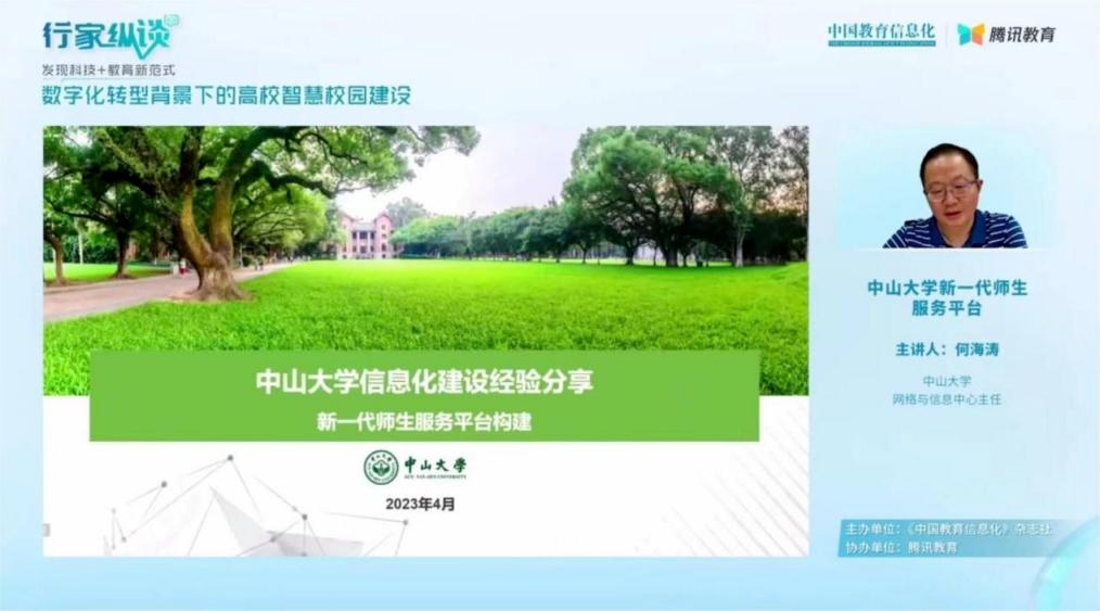 中山大学作为一所全国名校,在广州、珠海、深圳共分布有三个校区五个校园。物理空间上分散布局给中山大学带来了资源分配的挑战。为此,中山大学提出了“未来中大”新蓝图,旨在打造智慧化、泛在化与生态化的校园。何海涛介绍,针对三校区五校园的业务特点,中山大学的信息化建设起了以师生为中心的“一事”“一码”“一门”。“一事”,即打造跨校区便捷服务;“一码”,即连接“人”与“服务”;“一门”,即提供以“我”为中心的精准服务。