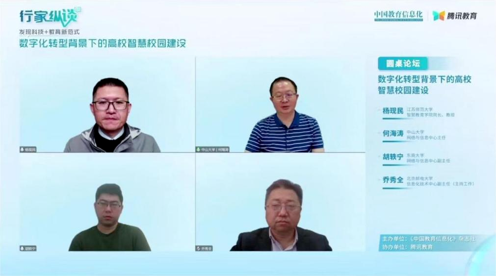 此外,在本次线上会议的圆桌论坛环节,中山大学网络与信息中心主任何海涛、东南大学网络与信息中心副主任胡轶宁、北京邮电大学信息化技术中心副主任(主持工作)乔秀全三位专家探讨了信息化落地进程中的体会。
