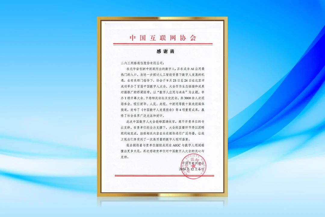 感谢信中表示,此次中国数字人大会能够圆满收官,离不开263的专业支持。在263的全力支撑下,大会的直播环节得以流畅顺利地完成,助推相关内容在社交媒体进行广泛传播,让线上观众们享受到了一次高质量的数字人视听盛宴。