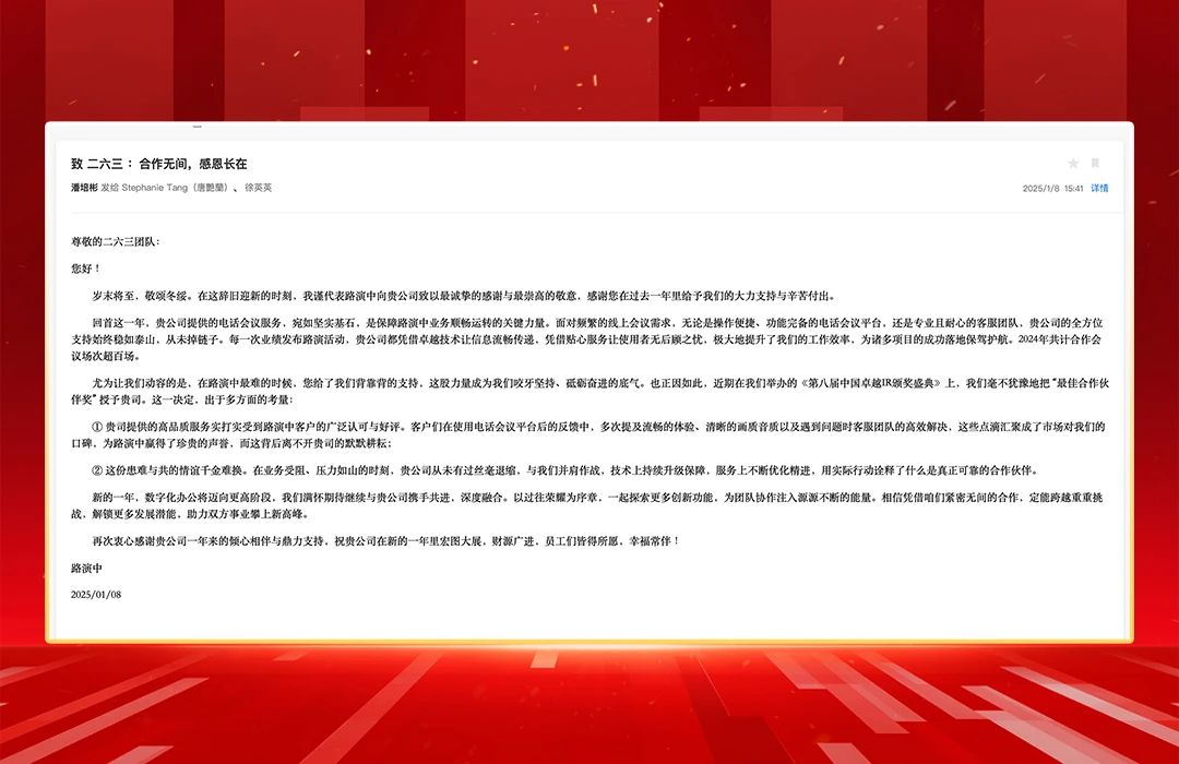 “在路演中最难的时候,您给了我们背靠背的支持,这股力量成为我们咬牙坚持、砥砺奋进的底气;在业务受阻、压力如山的时刻,贵公司从未有过丝毫退缩,与我们并肩作战,技术上持续升级保障,服务上不断优化精进,用实际行动诠释了什么是真正可靠的合作伙伴。”