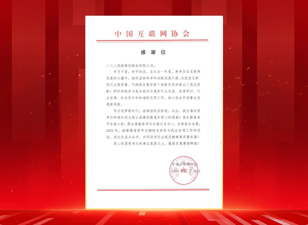 “在过去一年里,263始终坚持科学和创新发展之路,为促进互联网行业高质量、可持续发展发挥了积极作用并做出了突出贡献!同时积极参与我会组织开展的行业交流、政策研讨、行业自律、社会责任和标准制定等工作,助力中国互联网协会开创事业发展新局面!”
