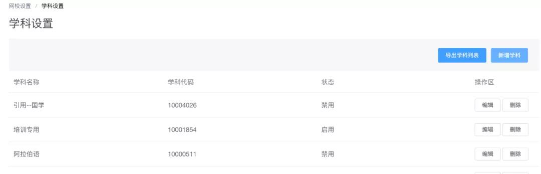 2)当前页可查看学科代码,或新增学科&导出学科列表