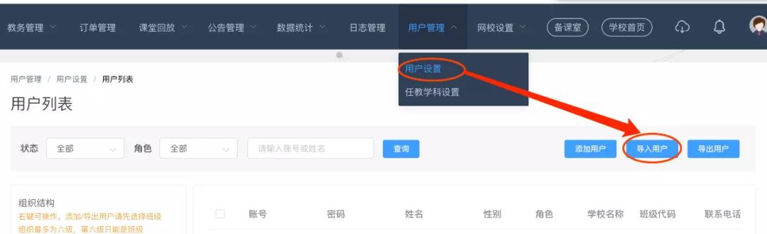 3)为教师批量导入学科:用户管理——用户设置——导入用户
