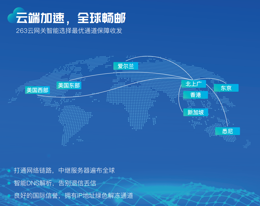 263私有云邮箱在国内关键网络节点均部署专线互联,在海外多地部署多个中转服务端,可全面保障全球收发顺畅,另外,263拥有丰富的IP地址资源和IP解冻绿色通道,当出现如邮件被拒收或IP被运营商拉黑等意外情况能够及时发现和解决。