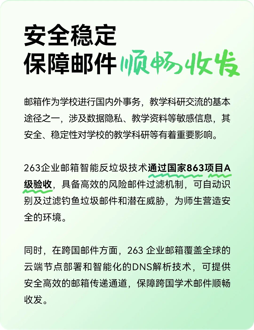 263深耕企业邮箱服务26年,有着丰富的邮箱系统搭建及大型项目实施经验,可为客户提供完善的邮箱技术支撑与服务保障,同时,263基于对教育行业需求的深刻理解,拥有完善的企业邮箱教育行业解决方案,成为了众多教育行业客户的信赖之选。
